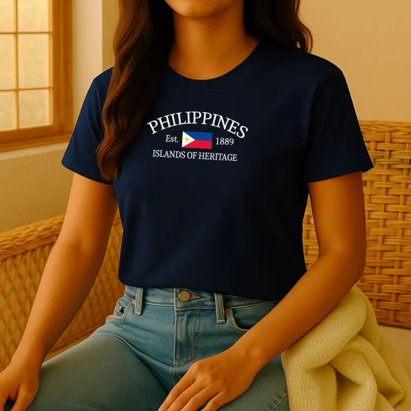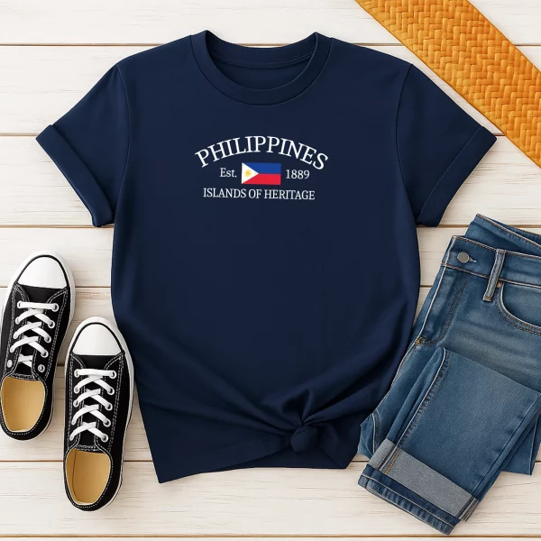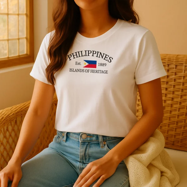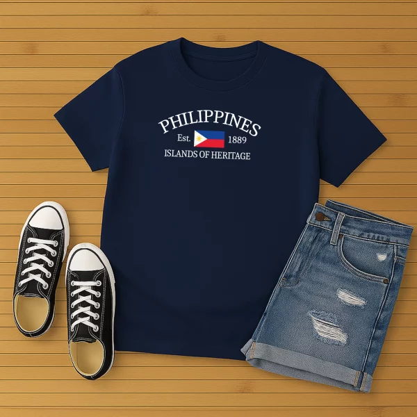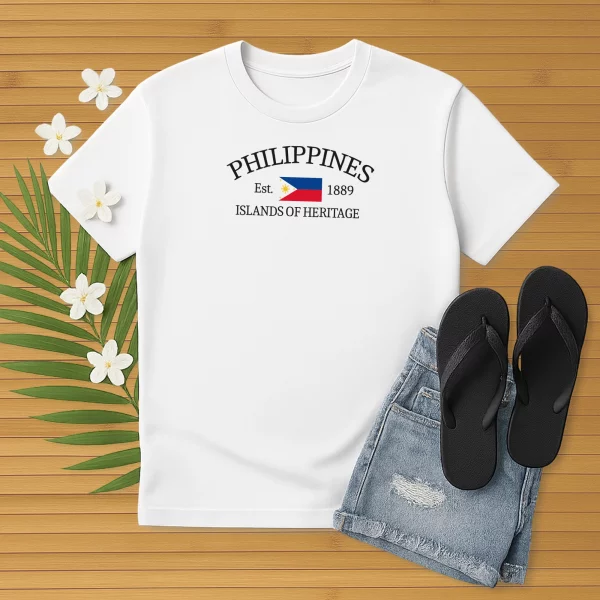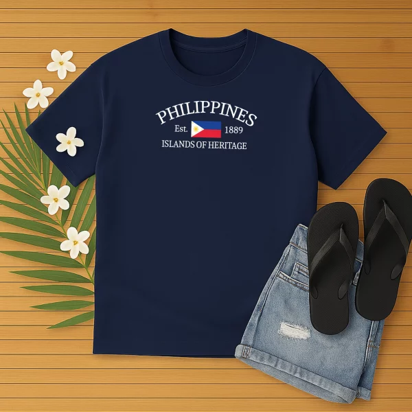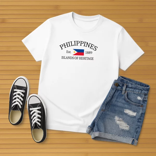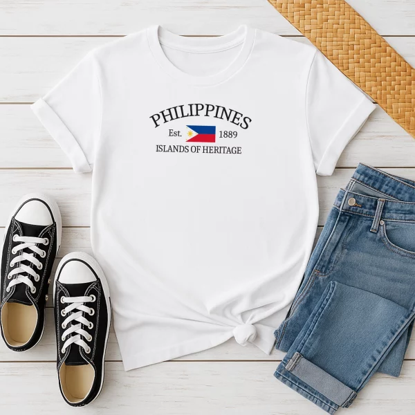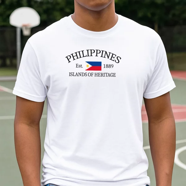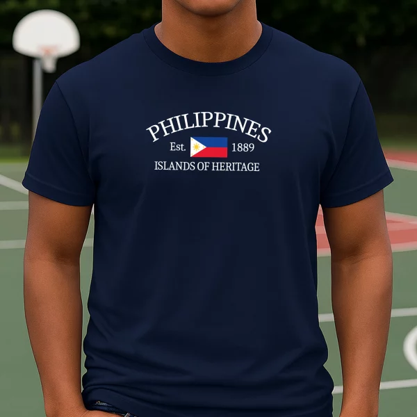 Wear your roots with pride! This basic tee features a minimalist design with the Philippine flag and “PHILIPPINES – Est. 1889 – ISLANDS OF HERITAGE”, a clean tribute to Filipino identity and legacy.